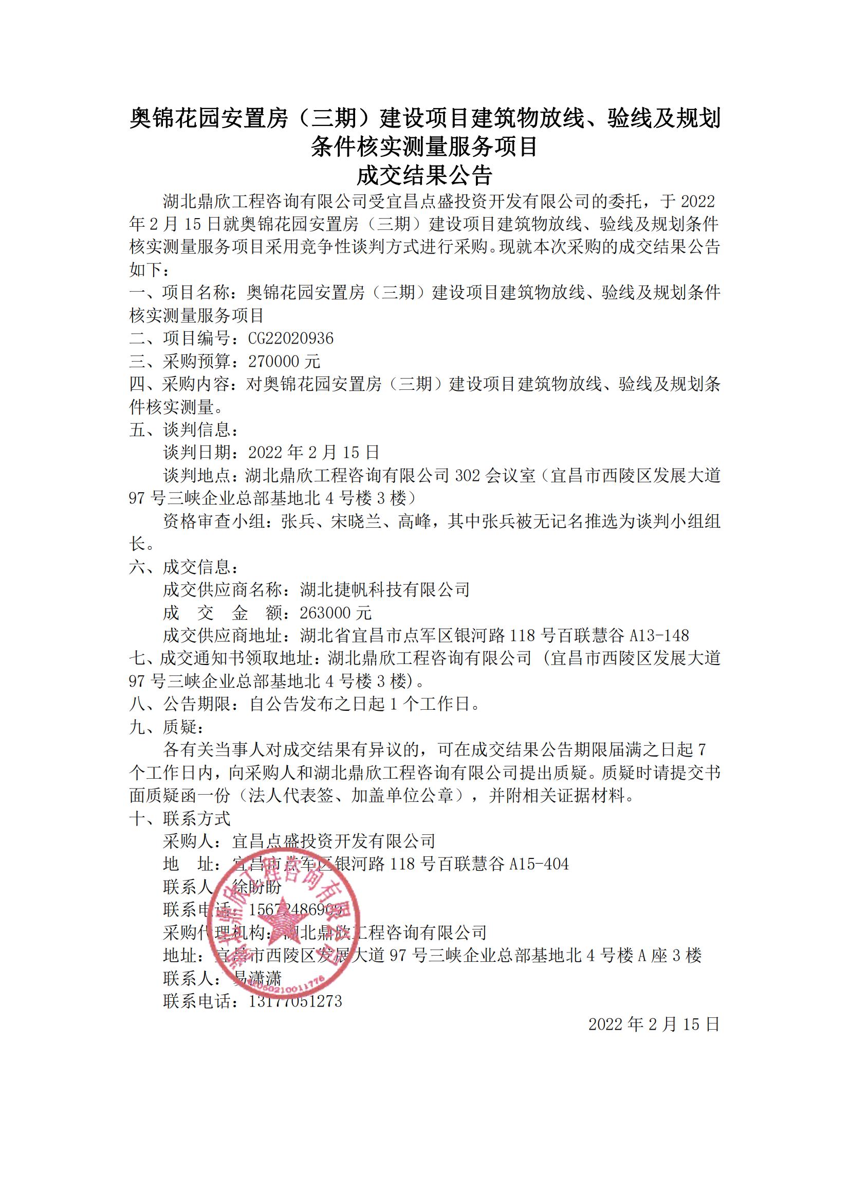奧錦花園安置房(三期)建設項目建筑物放線、驗線及規(guī)劃條件核實測量服務項目成交結果公告