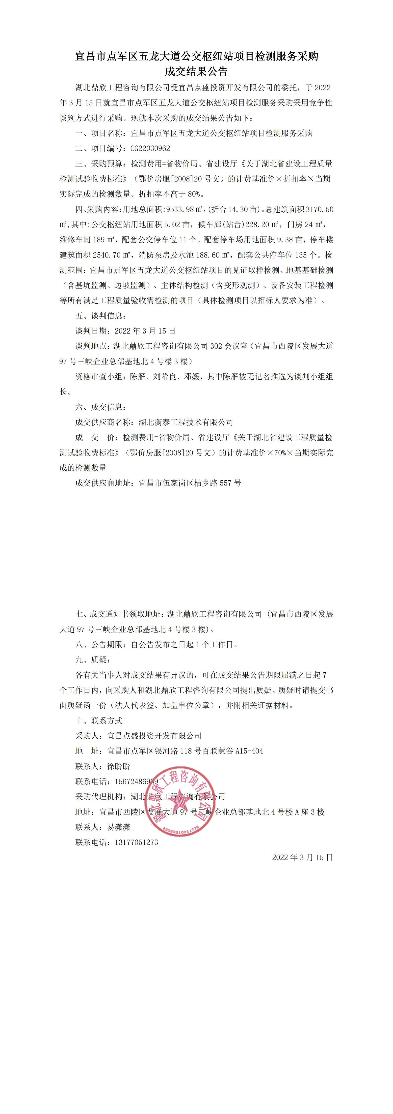 宜昌市點軍區(qū)五龍大道公交樞紐站項目檢測服務采購結果公告