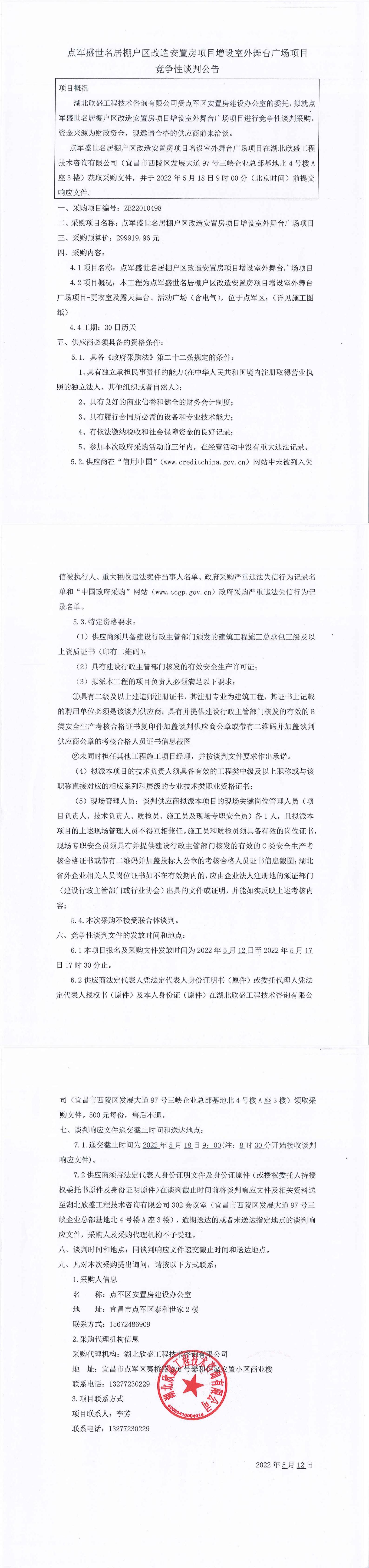 點(diǎn)軍盛世名居棚戶區(qū)改造安置房項目增設(shè)室外舞臺廣場項目談判公告