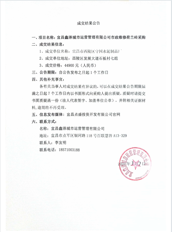 宜昌鑫澤城市運(yùn)營(yíng)管理有限公司市政維修荷蘭磚采購(gòu)項(xiàng)目成交公告