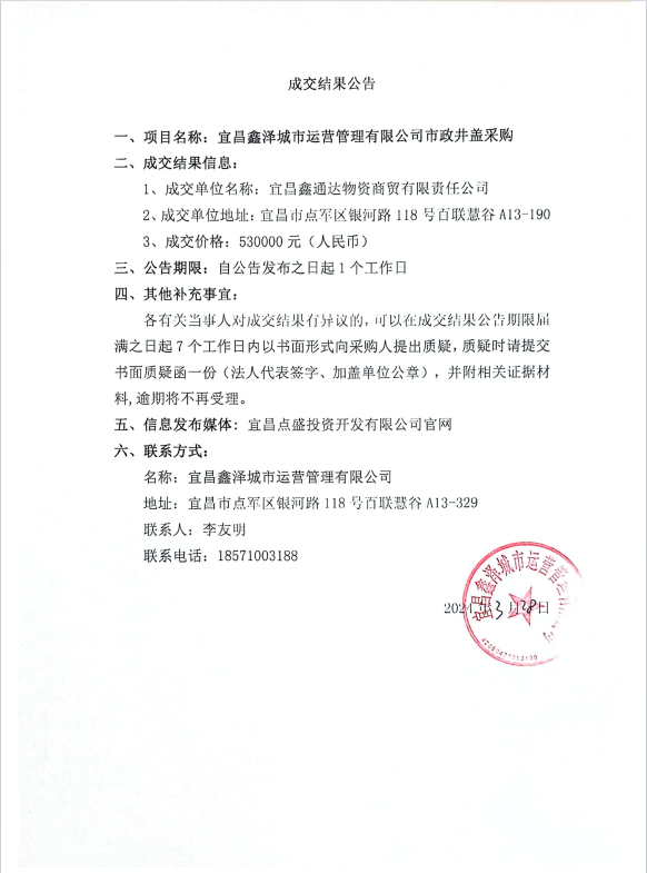 宜昌鑫澤城市運(yùn)營管理有限公司市政井蓋采購項(xiàng)目成交公告