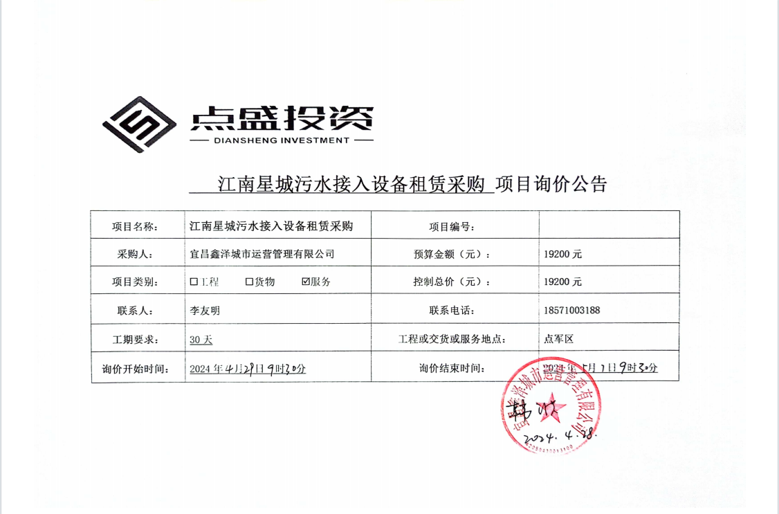 江南星城污水接入設備租賃采購詢價公告
