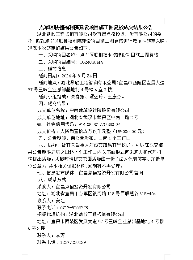 點軍區(qū)聯(lián)棚福利院建設項目施工圖復核成交結果公告