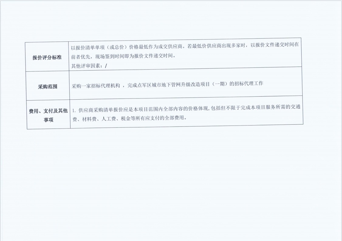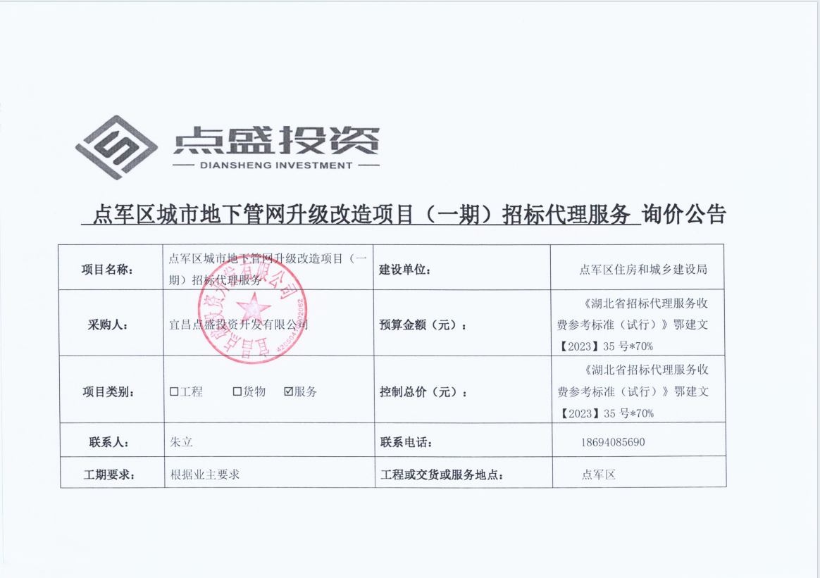 點(diǎn)軍區(qū)城市地下管網(wǎng)升級改造項(xiàng)目(一期)招標(biāo)代理服務(wù) 詢價(jià)公告