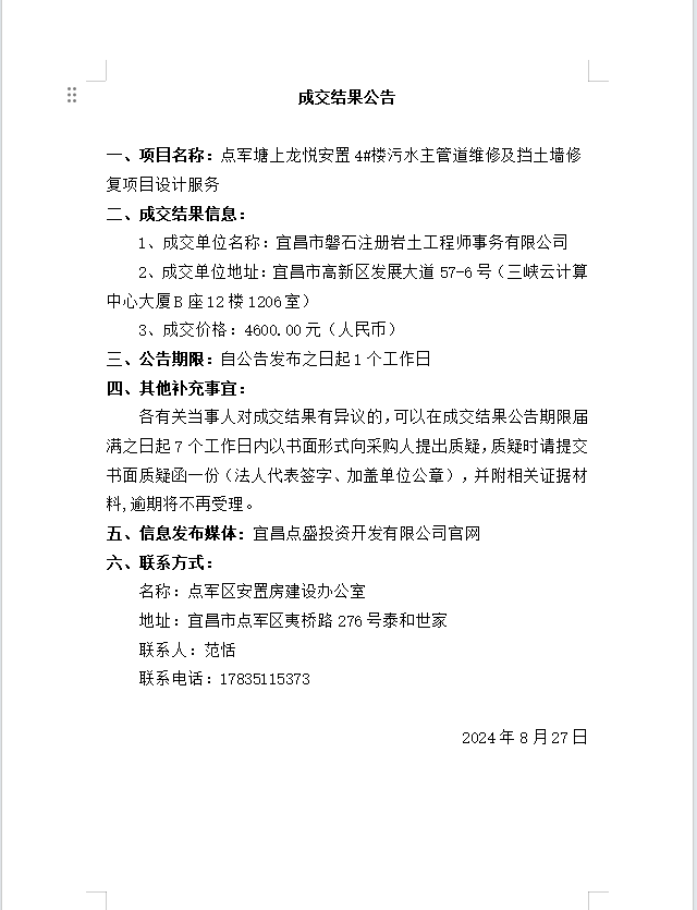 點軍塘上龍悅安置4#樓污水主管道維修及擋土墻修復項目設(shè)計服務(wù)成交公告