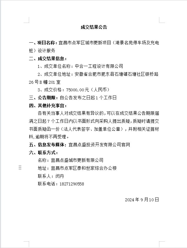 宜昌市點(diǎn)軍區(qū)城市更新項(xiàng)目(湖景名苑停車(chē)場(chǎng)及充電樁)設(shè)計(jì)服務(wù)成交公告