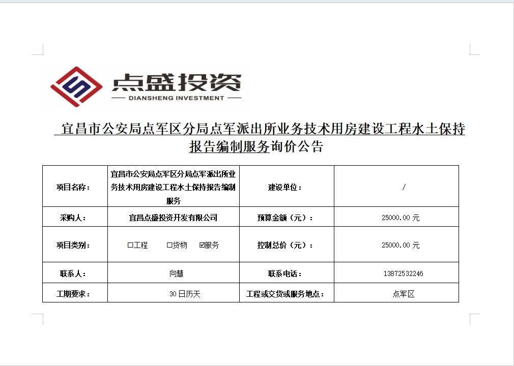 宜昌市公安局點(diǎn)軍區(qū)分局點(diǎn)軍派出所業(yè)務(wù)技術(shù)用房建設(shè)工程水土保持報(bào)告編制服務(wù)詢價(jià)公告