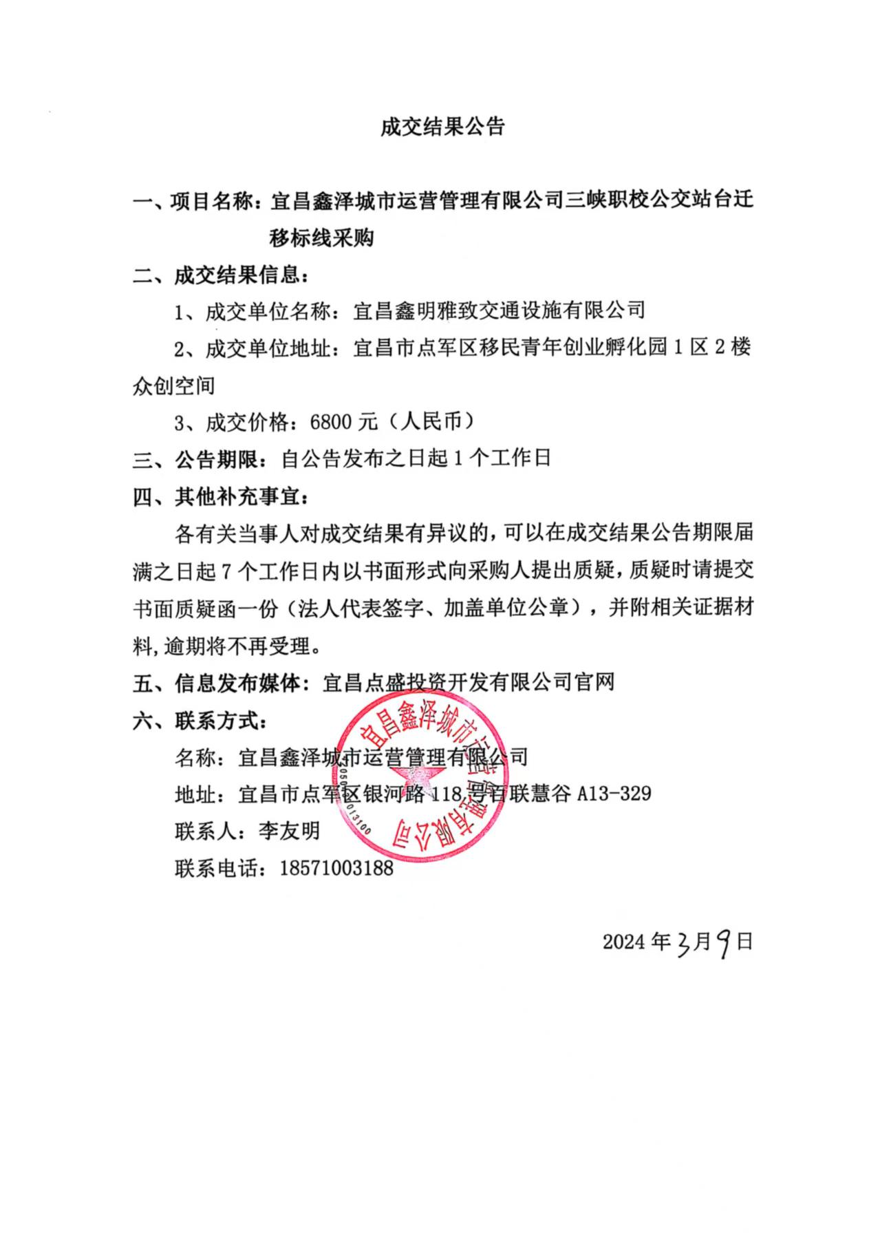 三峽職校公交站臺遷移標(biāo)線采購成交公告