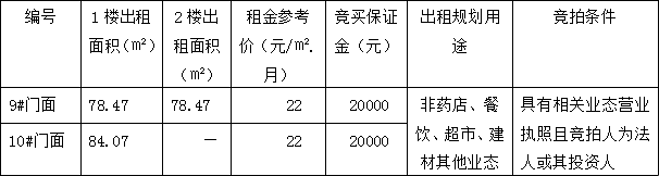 上述第9號(hào)門面房整體出租1至2樓,10#門面房只出租一樓。目前,上述門面房均處于空置的毛坯狀態(tài),現(xiàn)狀分別對外出租。相關(guān)競買事項(xiàng)詳見本公司拍賣資料中的《競買協(xié)議》樣本特別說明條款內(nèi)容,且標(biāo)的物自公告之日起至2021年12月10日17:00止,在標(biāo)的物現(xiàn)場展示(集中看房時(shí)間定于2021年12月10日8:30-12:00,14:00-17:00)。
